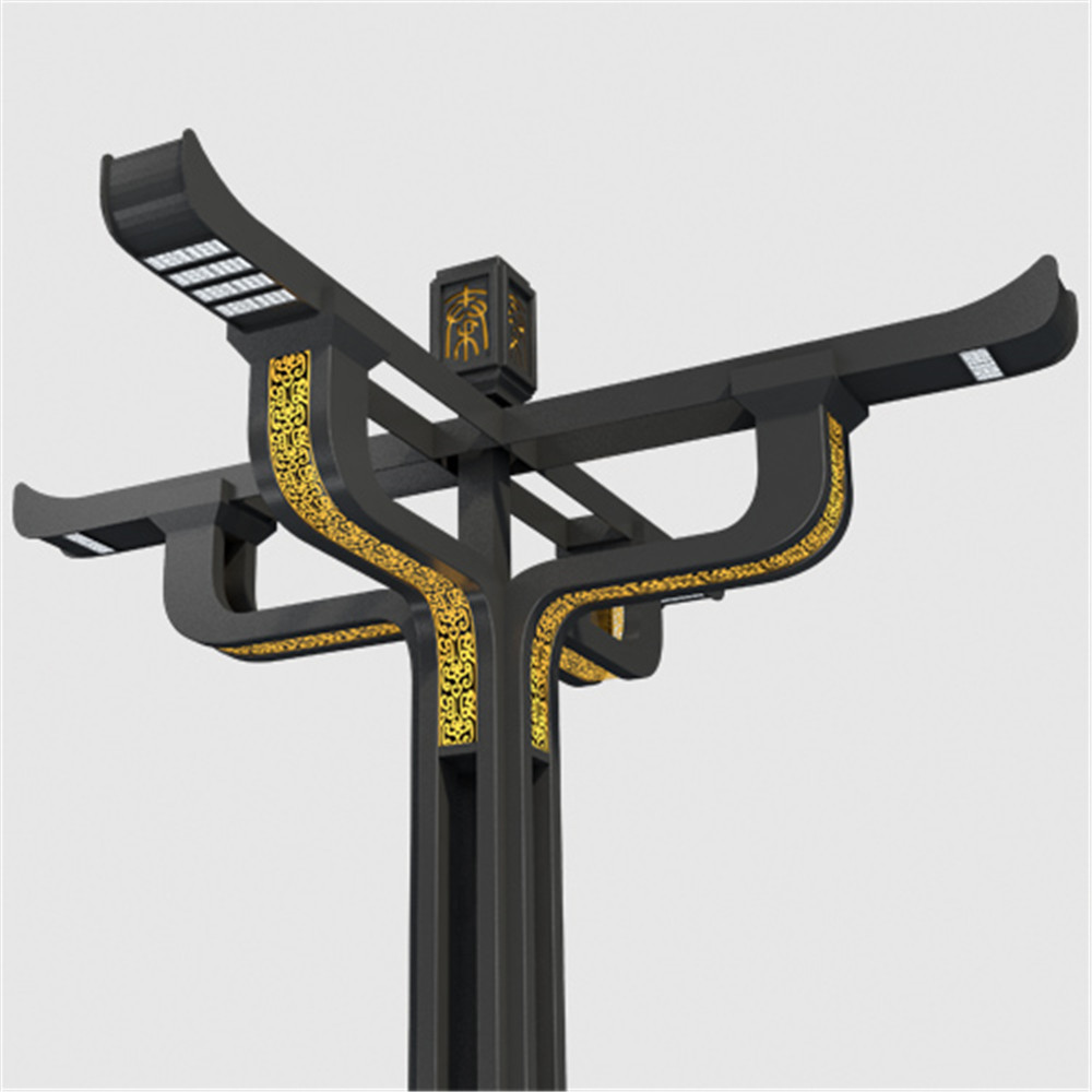 設計以秦漢建筑為元素,取秦代崇尚的黑色為主色調,燈臂裝飾以秦代紋飾,造型則提取自漢斗、漢闕。線條流暢、簡練,四向對稱的造型莊重大氣。