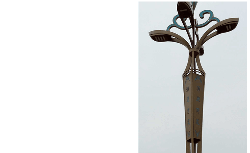 該燈型突出洞庭的荷花,荷花為中國十大名花之一,既具有觀賞價值,又象征高潔優(yōu)雅。佛教尊荷花為神圣凈潔之花,是“出淤泥而不染”清白圣潔的精神象征,燈桿花瓶造型寓意為觀音之凈瓶,含佛教旨意。