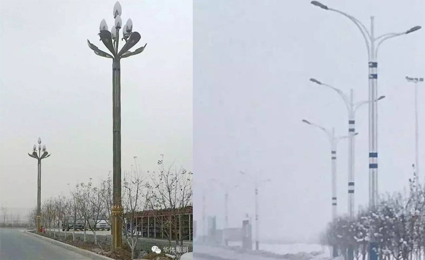 12月的石城已是零下10度左右,大雪紛飛,銀裝素裹。調(diào)皮的雪花輕輕地落在含笑燈上,一夜之間,含笑像是穿上了一件雪白的禮服,高雅端莊。遠(yuǎn)看好似一位優(yōu)雅的女子,飽含深情地望著遠(yuǎn)方,像是在等待遠(yuǎn)歸的愛人。10米雙臂路燈,以藍(lán)白為主要色調(diào),給人以干凈、利落之感。燈桿中部配置LED七彩燈條,為這雪白的王國增添五彩繽紛的樂趣。
