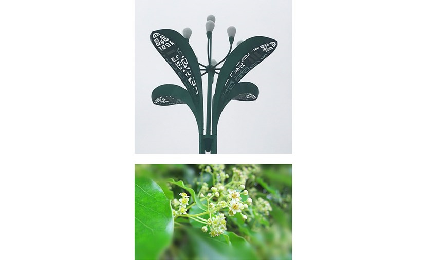 “香樟”景觀燈,根據(jù)祁陽縣縣樹香樟的形狀進行抽象設(shè)計,通過燈臂部分展開的樹葉和燈桿頂部即將盛開的香樟樹花朵相結(jié)合,讓路燈集道路照明和景觀裝飾照明于一體,提升祁陽夜間城市照明形象。