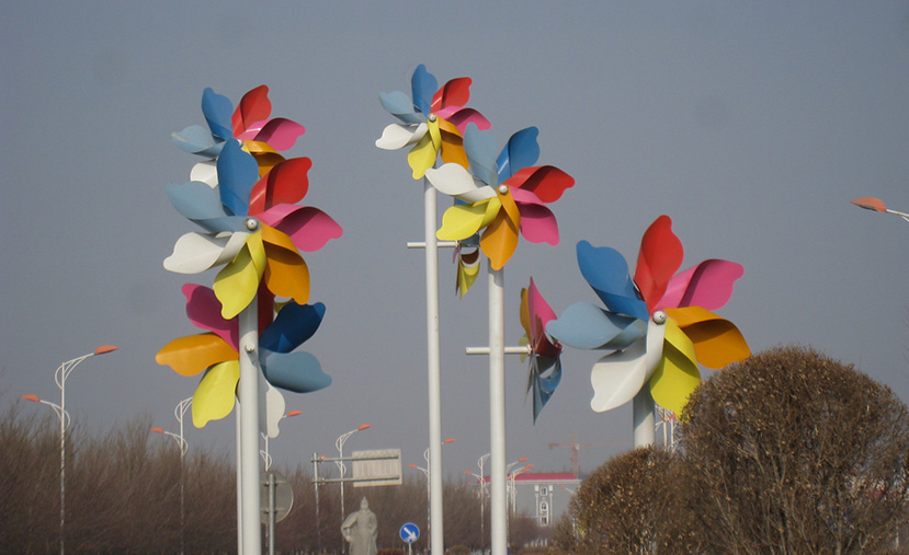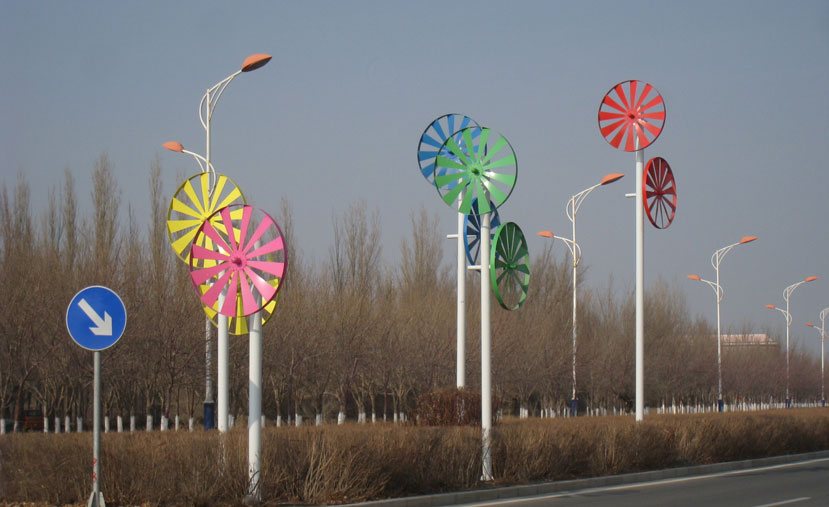 設(shè)計(jì)理念以風(fēng)車造型為創(chuàng)作元素,經(jīng)過(guò)設(shè)計(jì)者的提煉,設(shè)計(jì)為圓形風(fēng)車和四葉風(fēng)車兩種。葉片根據(jù)風(fēng)力學(xué)進(jìn)行設(shè)計(jì),可隨風(fēng)轉(zhuǎn)動(dòng),具有生命力。本項(xiàng)目中共運(yùn)用了五柱景觀風(fēng)車,安裝在達(dá)坂城洛賓路。