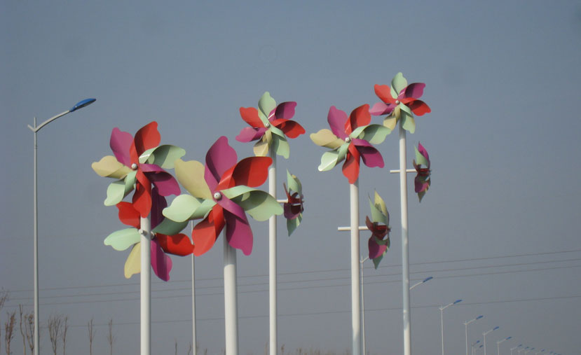該景觀風(fēng)車由黃、綠、藍(lán)、紅、紫、灰等多彩顏色組成,風(fēng)車直徑為1.6米。每柱高度為4米至8米不等,由低到高分布,賦予時(shí)尚感。獨(dú)特的白色燈桿兩側(cè),由兩個(gè)風(fēng)車連接桿體兩側(cè),形成高低臂造型,對(duì)稱性強(qiáng),形成獨(dú)特的風(fēng)車景觀。