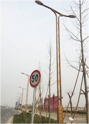 新區(qū)內(nèi)工業(yè)大道及幸福大道運(yùn)用的景觀路燈,曲線簡(jiǎn)潔大方。燈頭采用華體專利“和諧”,工業(yè)感強(qiáng),棕色桿體內(nèi)鏤空的金黃色紋理活潑生動(dòng),底座加載文化元素—漢儀篆書繁體“渭南新區(qū)美麗經(jīng)開”與“魅力新城 田園都市”字體垂直均勻分布于燈桿底座上。