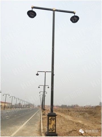 建設(shè)路,黑色桿體的景觀燈宏偉整齊的屹立在車道兩旁,矗立延伸,華麗而莊重。采用特殊工藝的自制燈頭,垂直于燈臂兩側(cè),立體感強(qiáng)。單桿連接的底座,黑色金屬板鏤空雕花,代表渭南市花月季栩栩如生,傳遞地域文化。