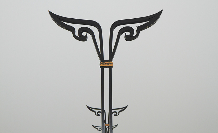 燈頭部分,以“鳥羽”為元素,設(shè)計(jì)形成燈背,并在燈背上表現(xiàn)古蜀文化符號,以鏤空的方式處理,讓燈背顯得厚重卻又不沉悶;在燈頭與燈桿、燈桿與底座之間分別設(shè)計(jì)處圓形的金色圍箍,用以加載魚鳧時期典型的“魚紋”圖案;底座上,加載玉璋,使文化內(nèi)容表現(xiàn)更加濃郁、豐富;燈桿部分,采用大膽創(chuàng)新的中空矩形燈桿,形成通透之感。